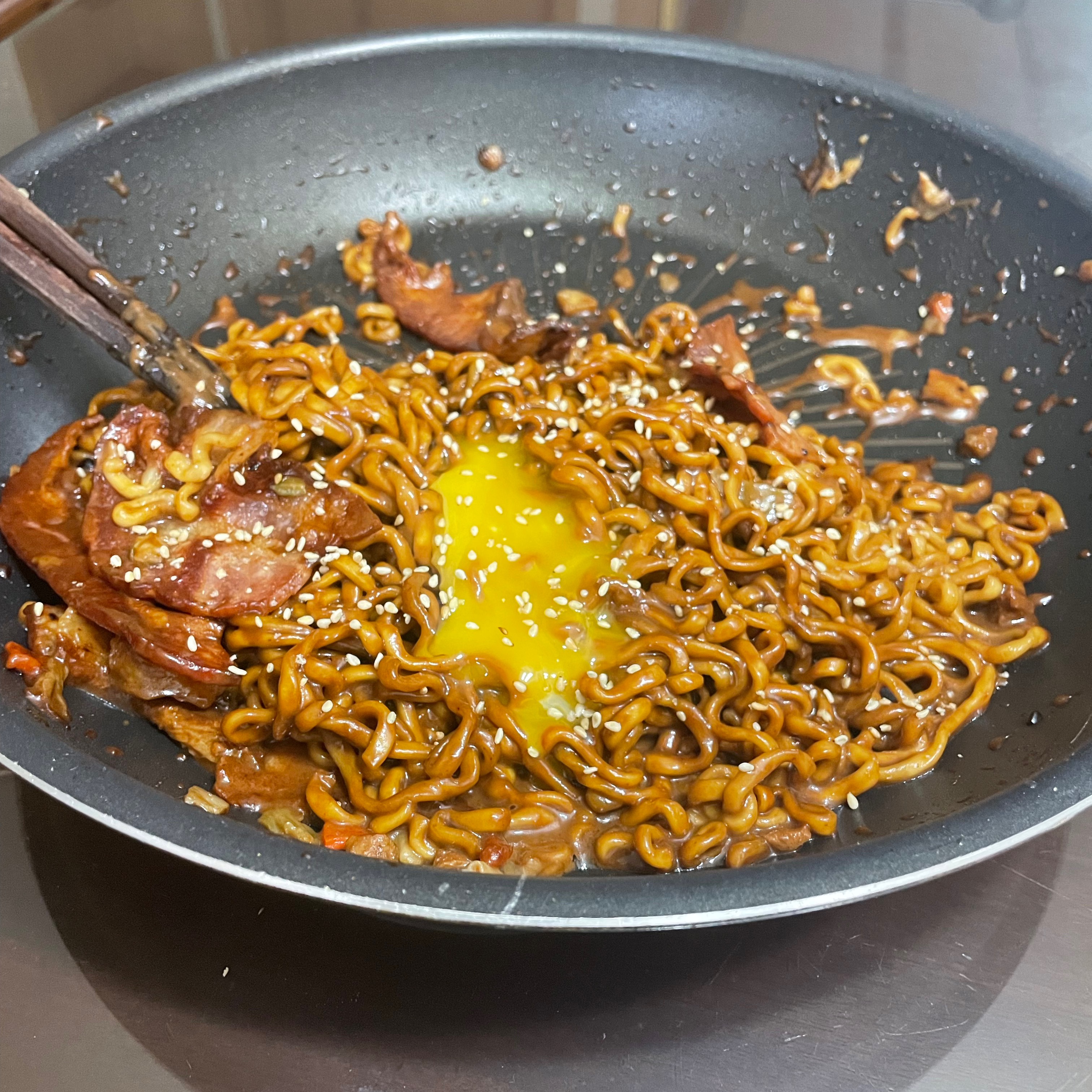 아직 코로나 증상이 없던 날의 저녁. 베이컨 굽다가 갑자기 삘꽂혀서 짜파게티도 하나 볶음