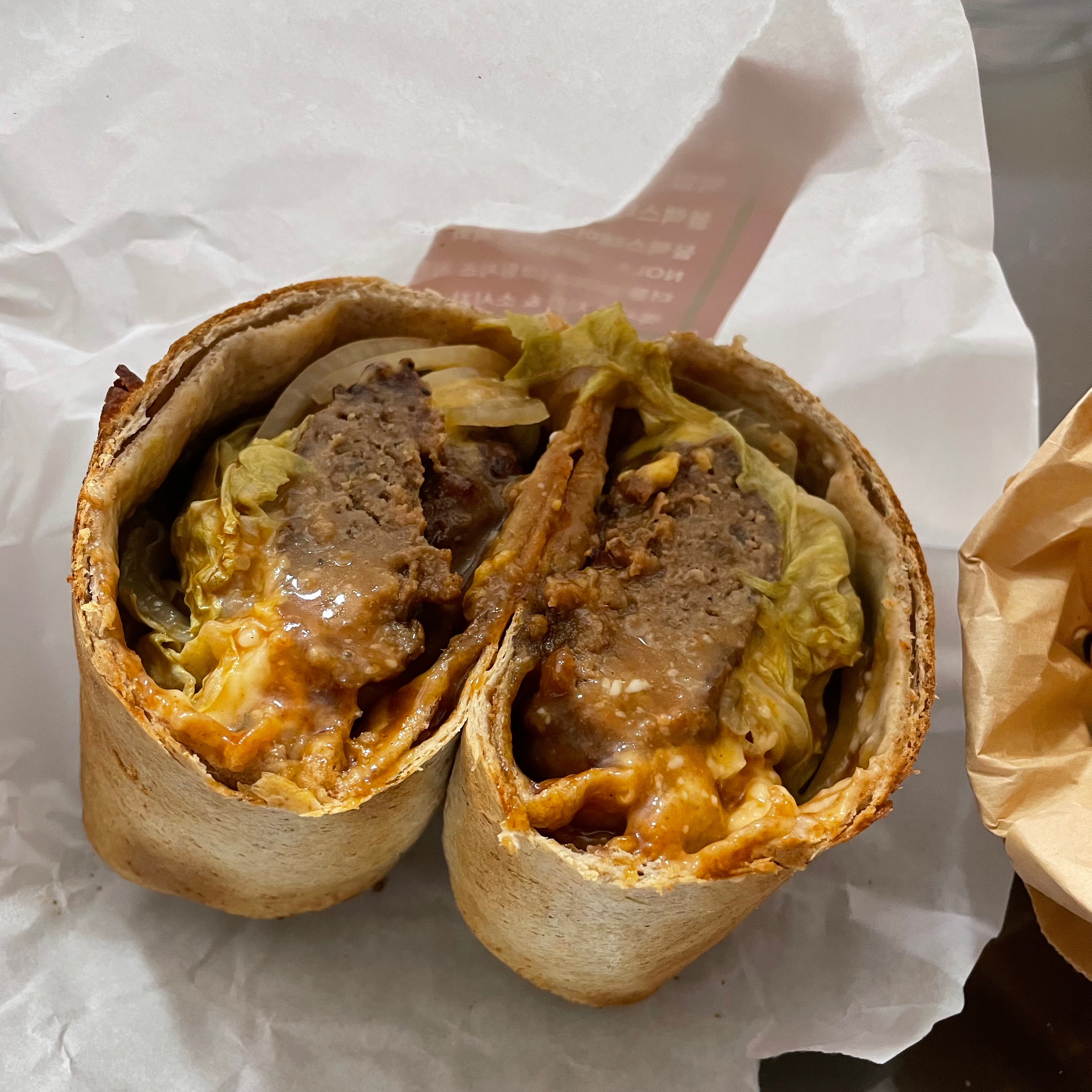 정체 불명의 음식을 파는 곳이 집 앞에 생겼길래 한번 찾아가봤다. 토르티야 같은 것 안에 햄버거 패티 비스무리한 걸 넣고 오븐에 구워서 내는 음식인데, 고기패티의 맛도 그저그런데다 소스가 달아 내 입맛엔 맞지 않았다. 내용물과 껍질 사이의 공간이 넓어 한 가지 음식을 먹는 듯한 느낌보다는 먹을 수 있는 종이컵에 담긴 고기완자를 먹는 느낌이었다.